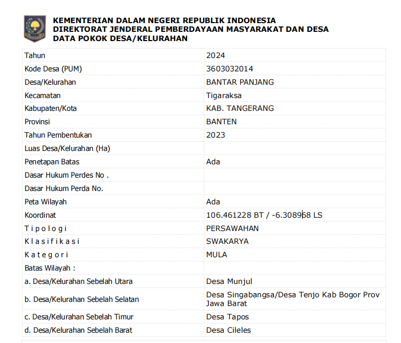 | Jarak Ke Ibu Kota Kabupaten/Kota (Km) | | 10,0000 |